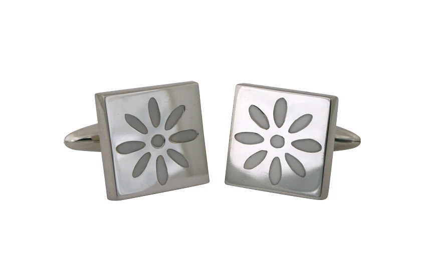Motivo floreale su base quadrata: petali allungati disposti intorno a un punto centrale delineano un segno pulito e contemporaneo. Questi gemelli fiore danno ritmo grafico alla camicia con un profilo nitido e una presenza discreta ma decisa. Indicati per celebrazioni, incontri significativi e traguardi professionali, quando si desidera evidenziare personalità e misura.